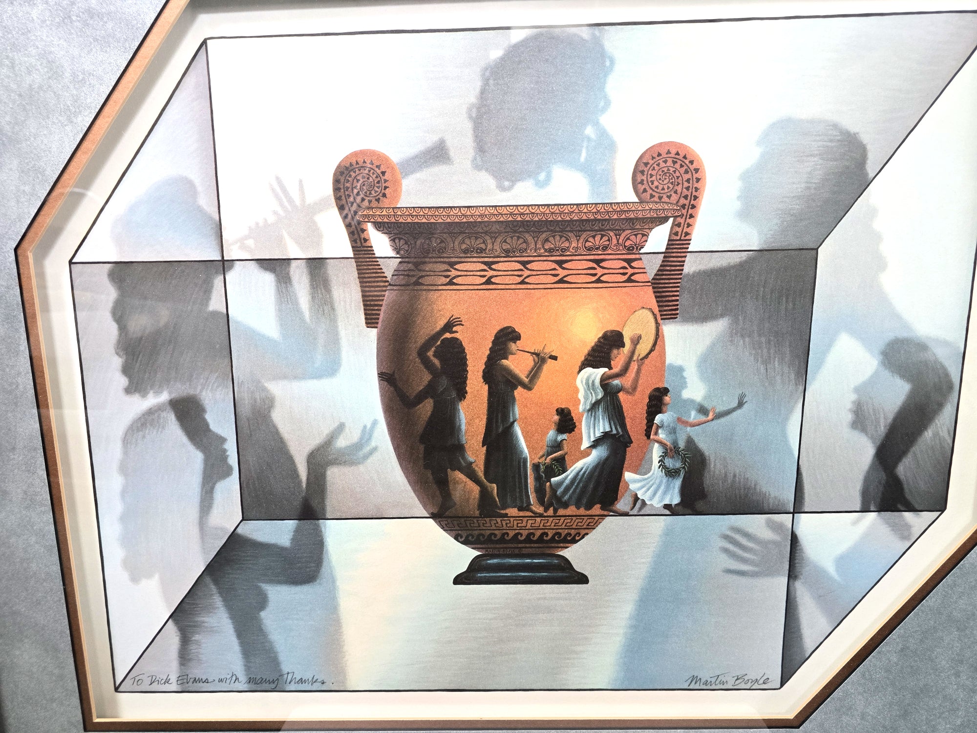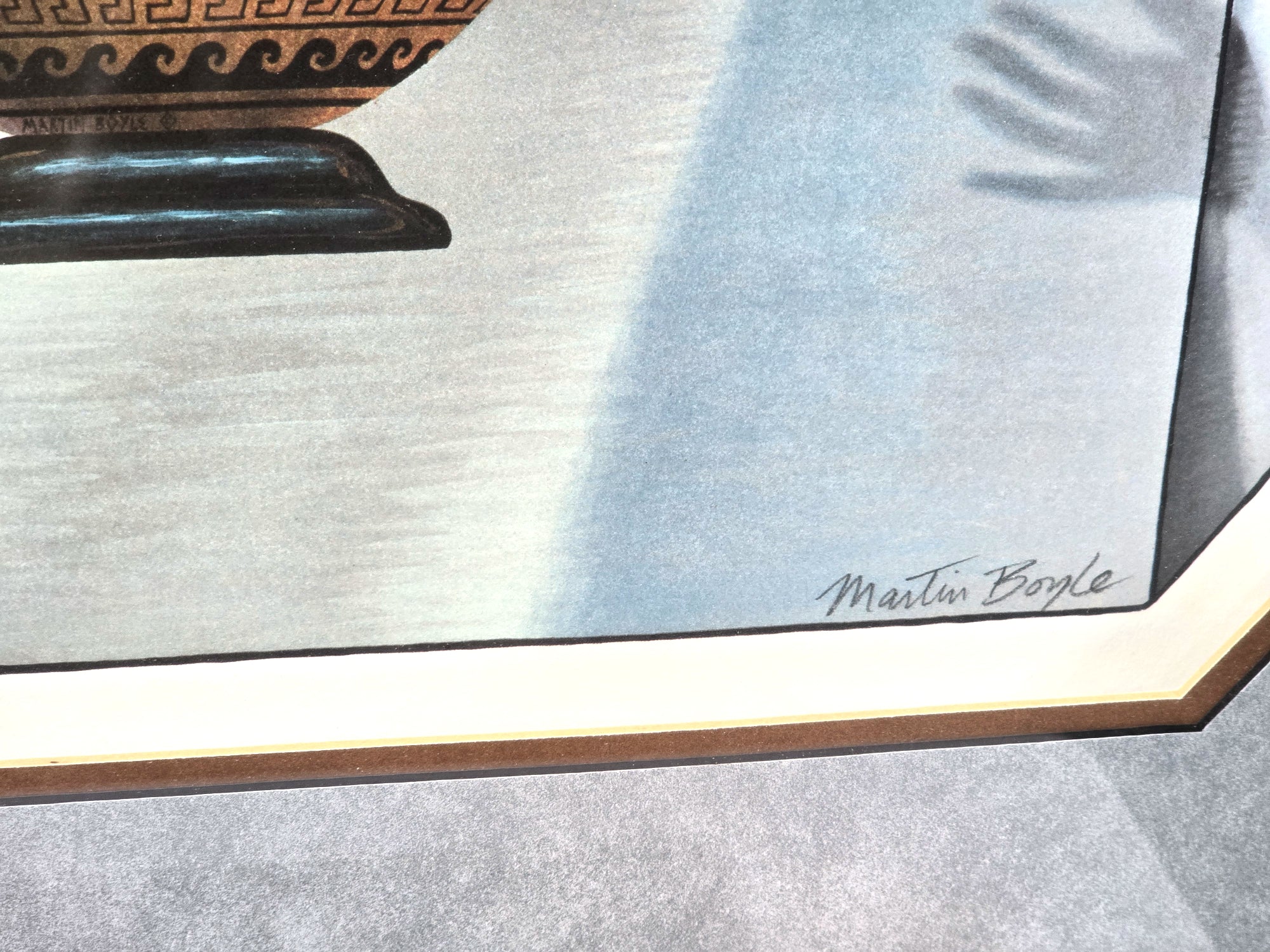 Martin Boyle, an undisputed master of optical illusion, challenges our desire for immediate understanding by prompting us to view his paintings from various perspectives, both literally and figuratively. His artwork is typically clear, harmonious, and subtly understated. Occasionally, Boyle includes his own profile in the margins of his paintings, a nod to the techniques of old Dutch masters. These mythological references, along with the purity and precision of his lines, reflect the classical influence prevalent in American university fine arts education.