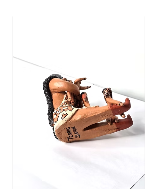 This handcrafted clay storyteller figure, signed by Terrie Saxon, beautifully embodies the rich tradition of Native American artistry. The figure depicts a woman with children, a classic representation of the "Storyteller" theme in Pueblo pottery. Storytellers are revered figures who pass down cultural heritage and wisdom through oral narratives. This particular piece likely draws inspiration from the Pueblo tribes of the Southwestern United States, where storytelling is an integral part of their culture. The artist, Terrie Saxon, has skillfully sculpted and painted the figure, capturing the essence of the Storyteller with intricate details and vibrant colors. This unique piece serves as both a decorative art object and a poignant reminder of the importance of preserving cultural traditions.