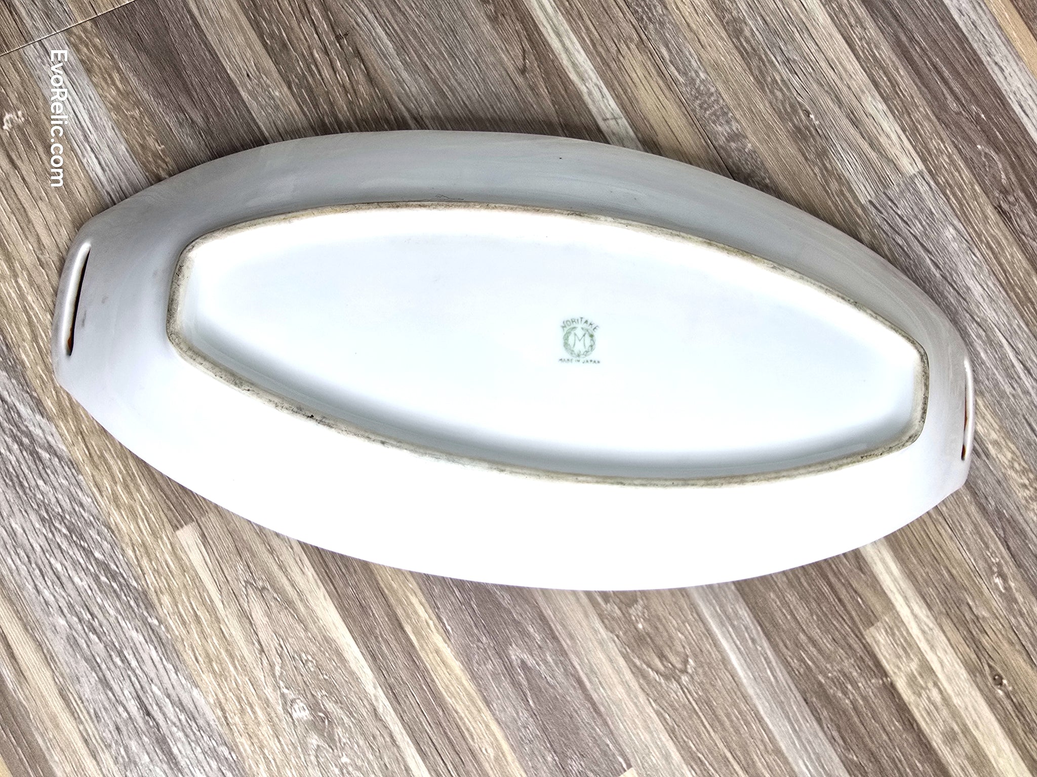 The Style (Lusterware): The vibrant, iridescent orange glaze is known as Lusterware. Noritake introduced this metallic, rainbow-like overglaze technique in the early 1920s, making it a signature style of their Art Deco export line. The geometric shape of the dish and the segmented floral cartouches are perfectly aligned with the popular decorative arts of the 1920s and 1930s.
