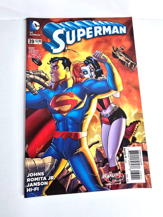 Superman #39, released on February 25, 2015, as part of DC Comics' New 52 initiative, features a special variant cover illustrated by Amanda Conner. This cover was part of DC's February 2015 "Harley Quinn Variant Month," during which Harley Quinn appeared on the covers of 22 different titles, showcasing her playful antics across the DC Universe.