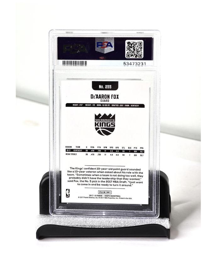 De'Aaron Fox Rookie Basketball Card NBA 2017 Panini No. 255 PSA Graded Mint Condition, See Photos - Includes FREE SHIPPING. Note sports memorabilia projected $30 Billion revenue in 2030 with returns on investment about 6% Compound Annual Growth Rate (CAGR).