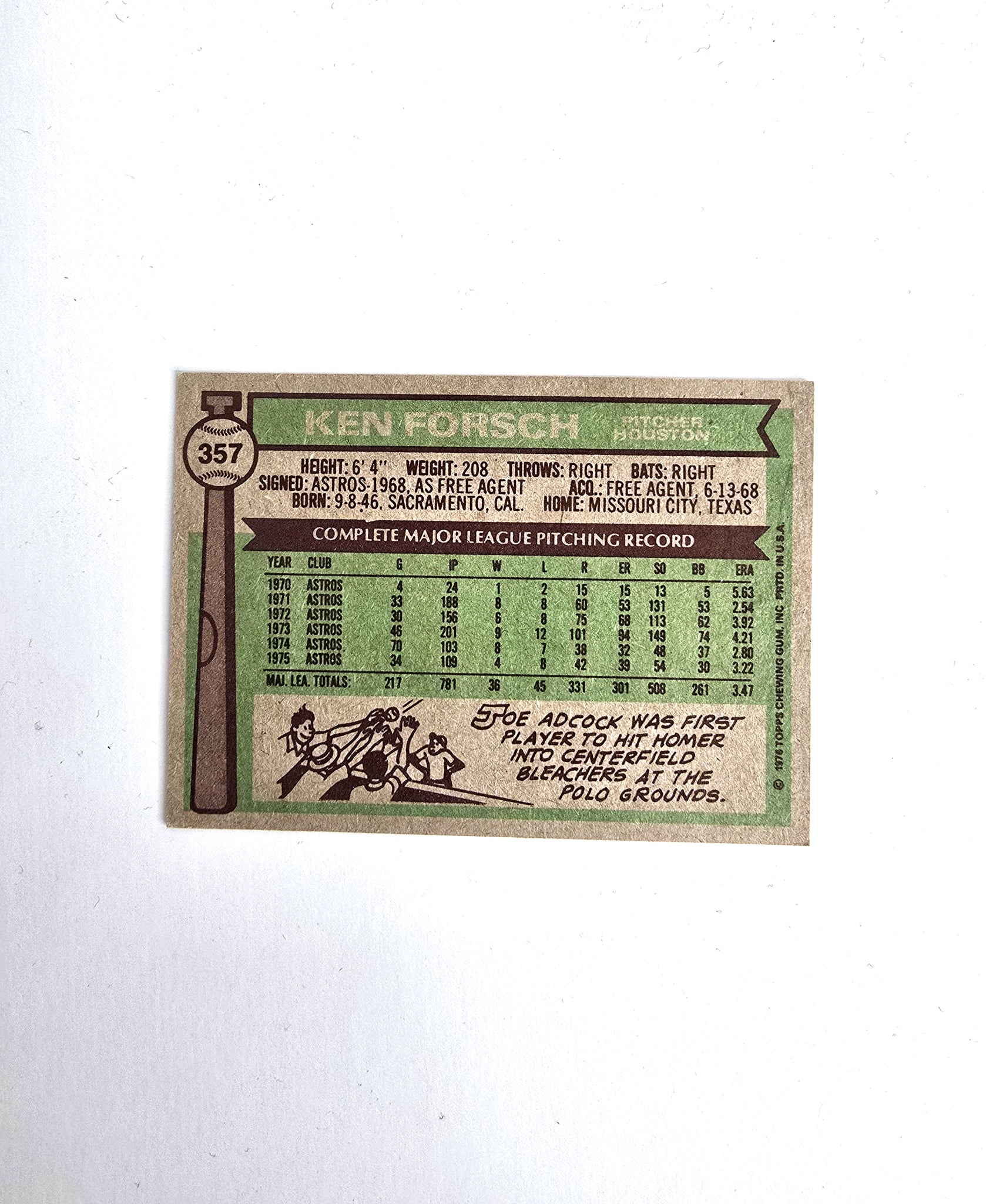 Ken Forsch Baseball Card 1976 Topps No. 357 - Excellent Condition, Some Wear Visible See Photos ... Includes FREE SHIPPING. Note sports memorabilia market hit $16 billion in 2023. Projections indicate it will reach $52 billion by 2032, with a compound annual growth rate (CAGR) of nearly 14% during the forecast period (2024-2032).