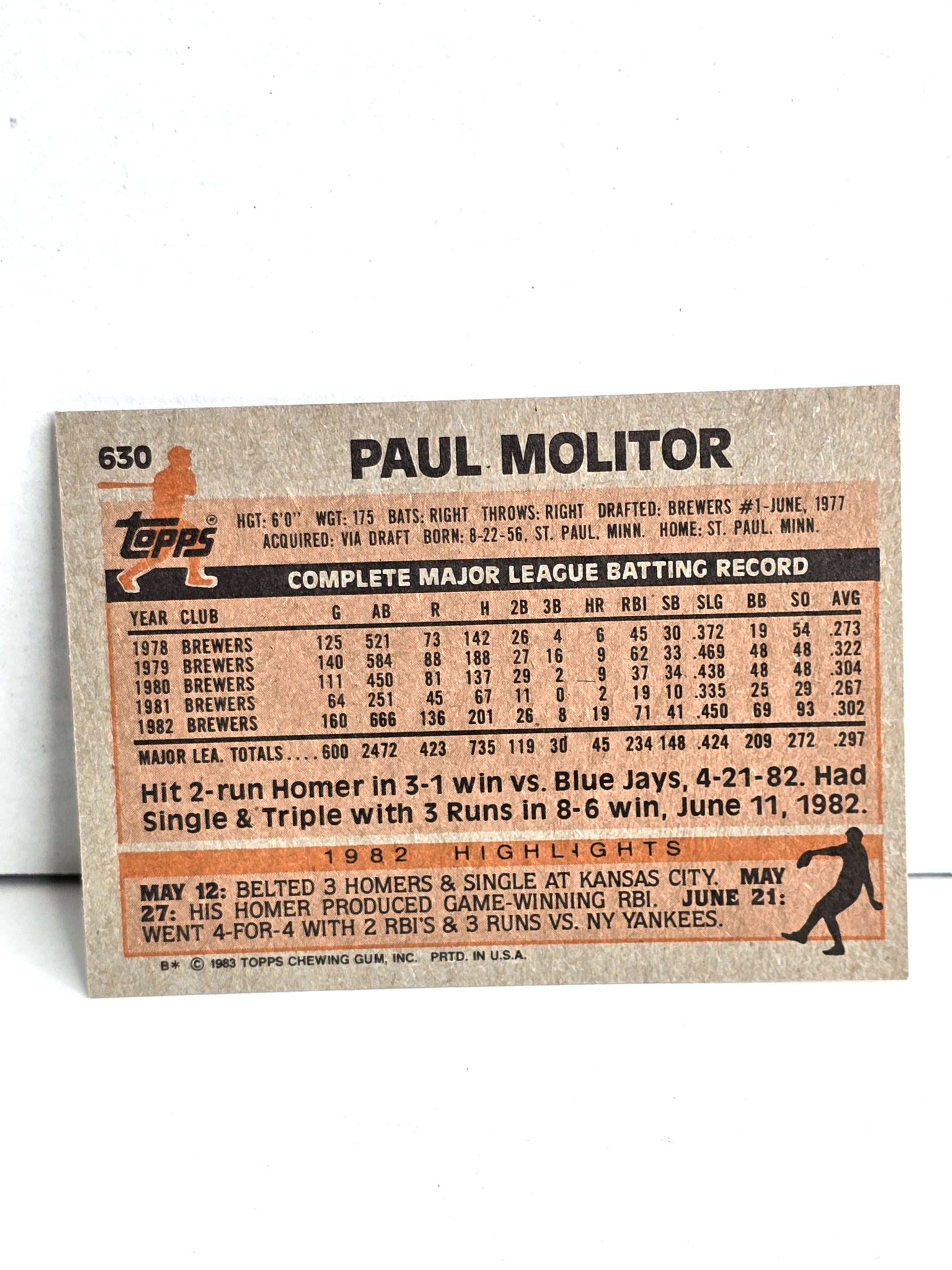 Paul Molitor Brewers Baseball Card 1983 Topps No. 630 - Near Mint Condition, See Photos ... Includes FREE SHIPPING. Note sports memorabilia market hit $16 billion in 2023. Projections indicate it will reach $52 billion by 2032, with a compound annual growth rate (CAGR) of nearly 14% during the forecast period (2024-2032).