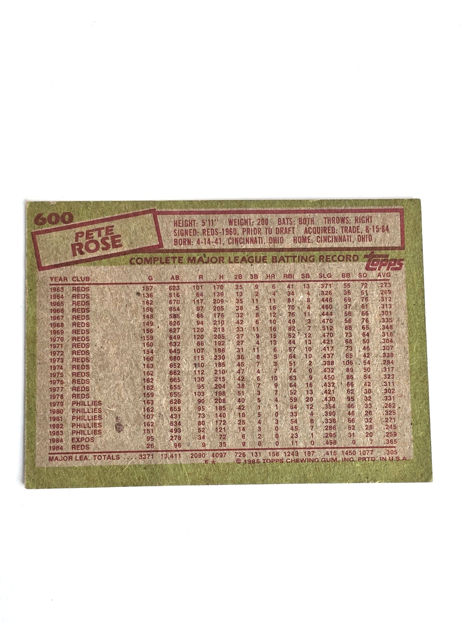 Pete Rose Baseball Card 1985 Topps No. 600 - Axiom Graded Very Good Condition, See Photos ... Includes FREE SHIPPING. Note sports memorabilia market hit $16 billion in 2023. Projections indicate it will reach $52 billion by 2032, with a compound annual growth rate (CAGR) of nearly 14% during the forecast period (2024-2032).