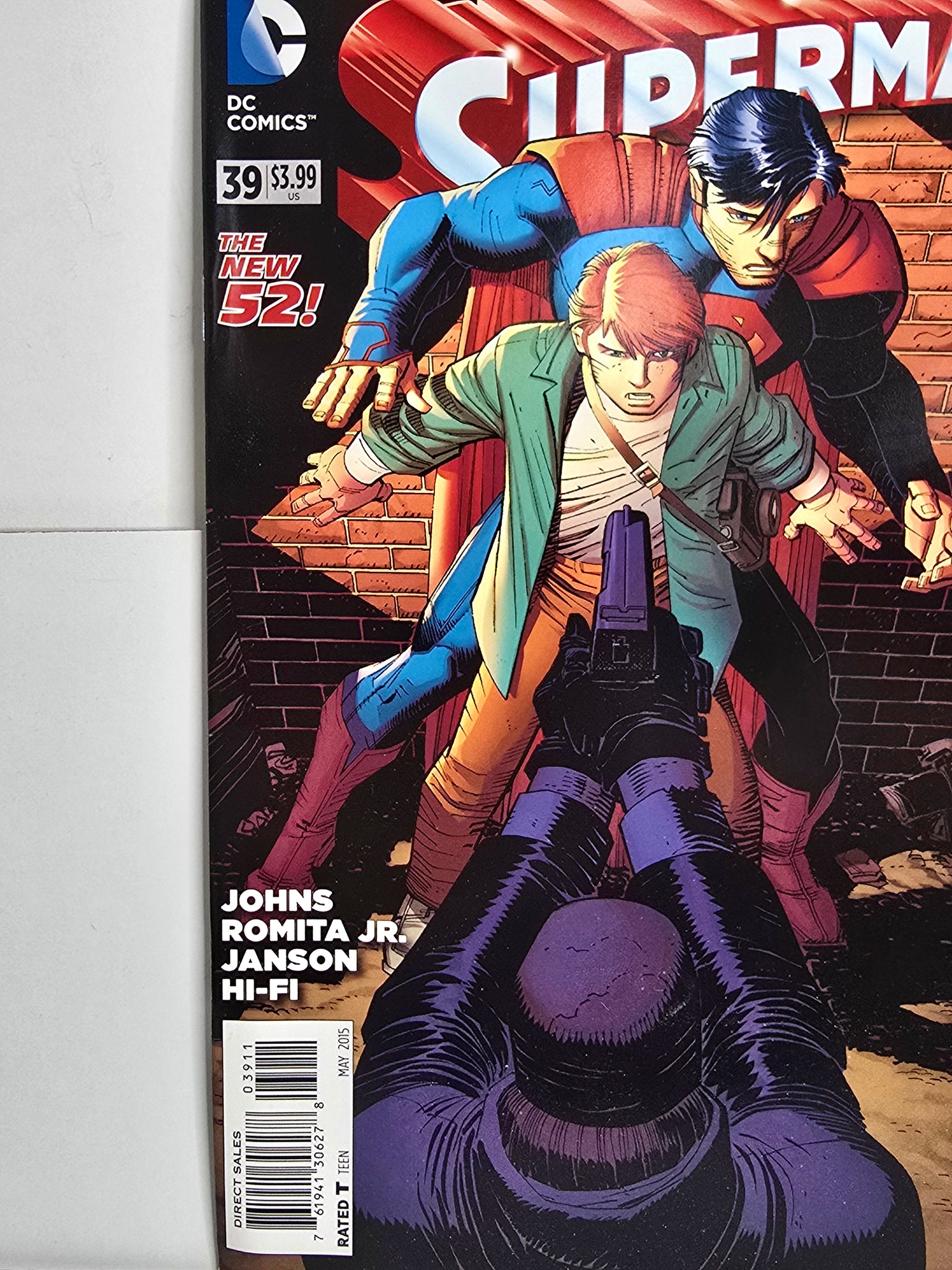 In May 2015, DC Comics released Superman #39, an issue within the ongoing New 52 continuity written by Geoff Johns with art by John Romita Jr. Following the dramatic events of the previous issue where Superman unleashed his new "Super Flare" power for the first time, this issue explored the immediate aftermath and consequences of that immense energy expenditure, including its temporary de-powering effect. As part of Johns and Romita Jr.'s significant run on the title, issue #39 continued to build towards the major "Truth" storyline that would see Superman's identity exposed to the world, further complicating the life of the Man of Steel.
