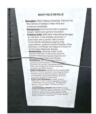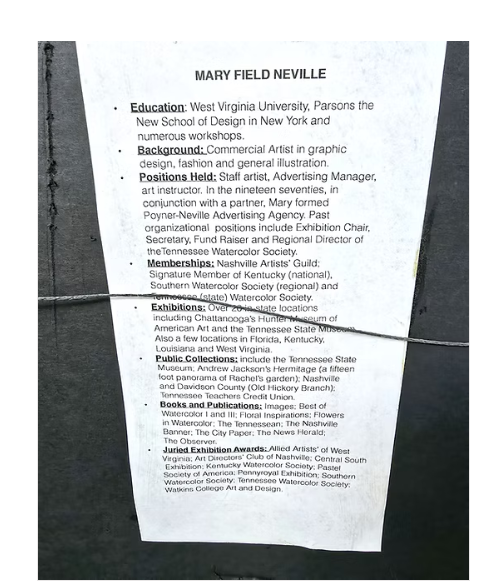 M. Neville (1932-2024), a popular artist, native of W. Virginia, was educated at W. Virginia University and School of Design. She worked as a commercial artist in New York City graphic design, fashion and general illustration; she has held positions as advertising manager and art instructor giving workshops and teaching privately throughout the South. Based in Nashville middle Tennessee, her paintings of mostly watercolors, sketches and oil on canvas are included in private and public collections including the Tennessee State Museum and historic venues such as Andrew Jackson’s Hermitage. M. Neville held many prominent arts positions: Board member of the Madison Art Center, Tennessee Watercolor Society (Regional Director, Secretary, and Exhibition Chair), a member of the Nashville Artist Guild and a signature member of the Kentucky, Southern, and Tennessee Watercolor Societies.