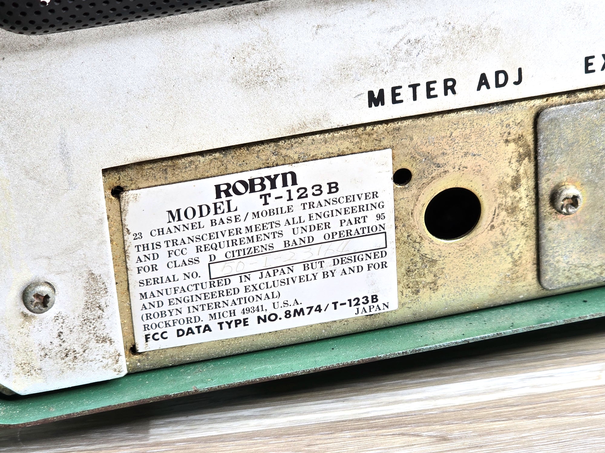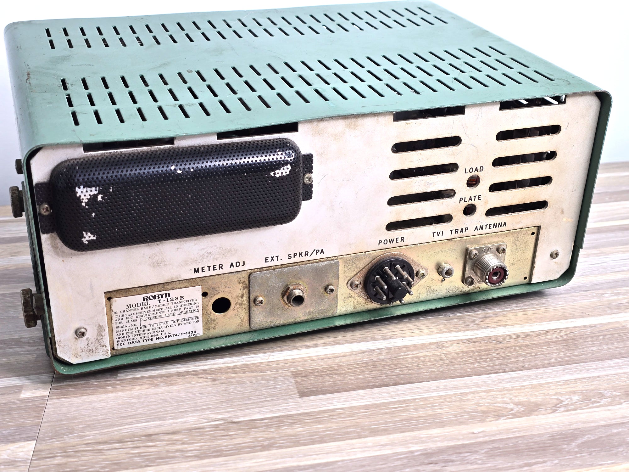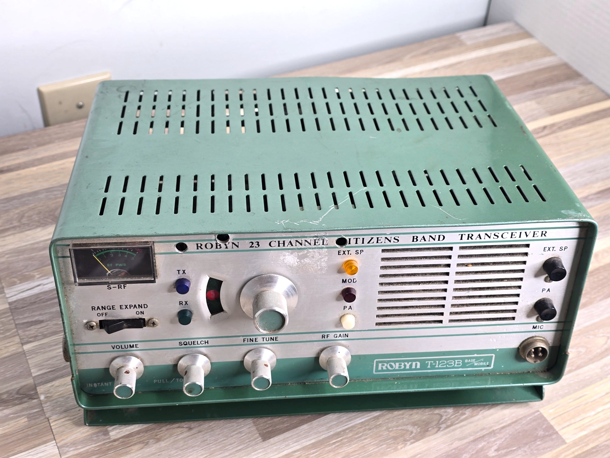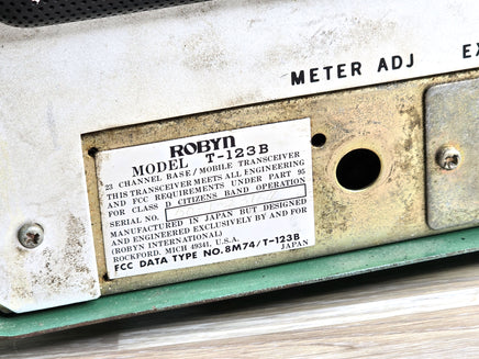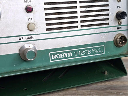 The Robyn T-123B is a vintage 23-channel AM CB radio transceiver that emerged during the golden age of citizens band radio in the 1970s. This American-made base station unit is notable for its use of vacuum tubes, a characteristic that enthusiasts praise for its warm and robust audio quality. The T-123B could be powered by either a standard 105-120 VAC wall outlet or a 12-14 VDC source for mobile operation. A distinctive feature of some models was the "instant on" capability, where the tube filaments remained partially lit when the radio was off but plugged in, allowing for quicker operation upon startup. The transceiver featured a classic design with a gray or green-lit face, chrome accents, and a metal locking ring connector for the microphone. As a hybrid unit, it incorporated both tube and solid-state components, reflecting the technological transition of the era. Known for its solid performance, the Robyn T-123B remains a sought-after piece for vintage radio collectors and operators who appreciate its analog excellence and nostalgic appeal.