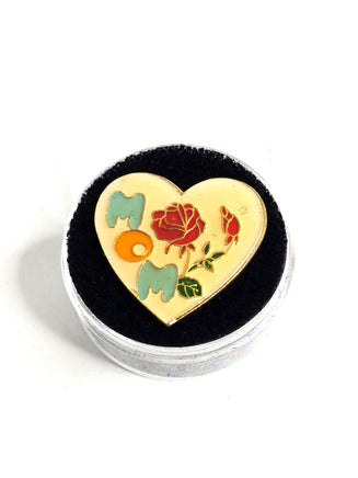 This vintage collectible pin, shaped like a heart, features "MOM" in playful, colorful lettering alongside a red rose and bud. Its charming design makes it a sweet and nostalgic token, perfect for expressing affection.